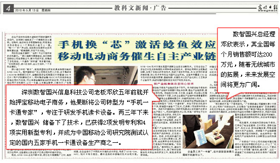5月13日,在光明日报第4版刊登《手机换"芯"激活鲶鱼效应移动电动商务催生自主产业链》的文章中,概括描述了我公司董事长邓欣的创业历程和对手机一卡通产业的信心。