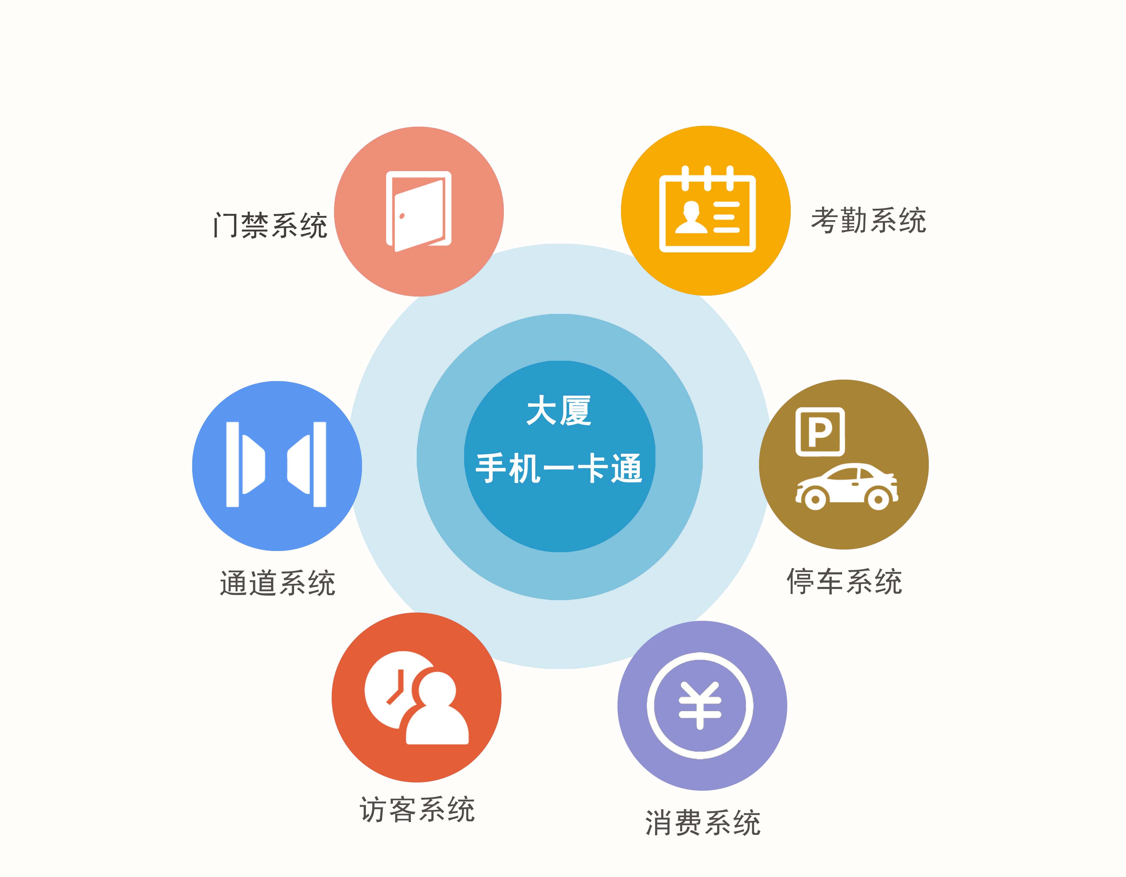 ▌系统和功能 数智国兴大厦手机一卡通是基于智能大厦管理的现状,本着网络集成化、安全性、可扩展性、先进性的设计原则,通过互联网、物联网技术与身份认证、小额支付,第三方应用等技术相结合,为智能大厦的智能管理提供了全方位的解决方案。大厦手机一卡通提供以手机为载体的门禁、消费、考勤、访客、通道、停车等一卡通应用服务和智能维护。