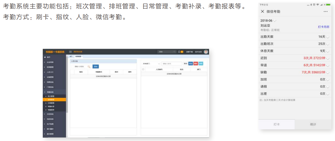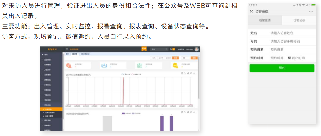 ▲ 应用模块 应用模块包括门禁、消费、考勤、会议、停车、订餐、通道、访客、巡更、水控、电控、圈存、电子批 假、微信商城、人脸识别、指纹识别等,可对接第三方 管理平台和设备,支持个性化定制服务。 ▲ 应用模块介绍 1.微信订餐系统