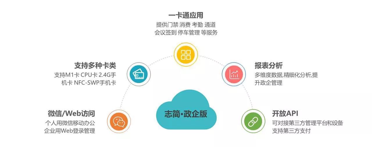 志简政企版,架构于云端,采用的是B/S架构,实现中心数据库和应用层的隔离,屏蔽用户直接对数据库进行操作,保证数据的安全,同时支持多数据库,后台数据库的变化与前台的操作无影响。志简一卡通云服务系统整体由身份识别载体、网络环境、设备材料、PC端应用软件、手机端应用软件、智能终端设备和奇点智服七部分组成。