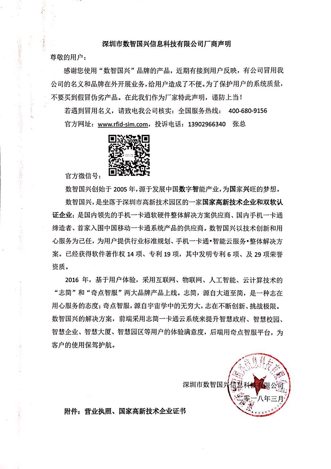 感谢您使用“数智国兴”品牌的产品,近期有接到用户反映,有公司冒用我司的名义和品牌在外开展业务,给用户造成了不便。为了保护用户的系统质量,不要买到假冒伪劣产品。在此我们作为厂家特此声明,谨防上当!