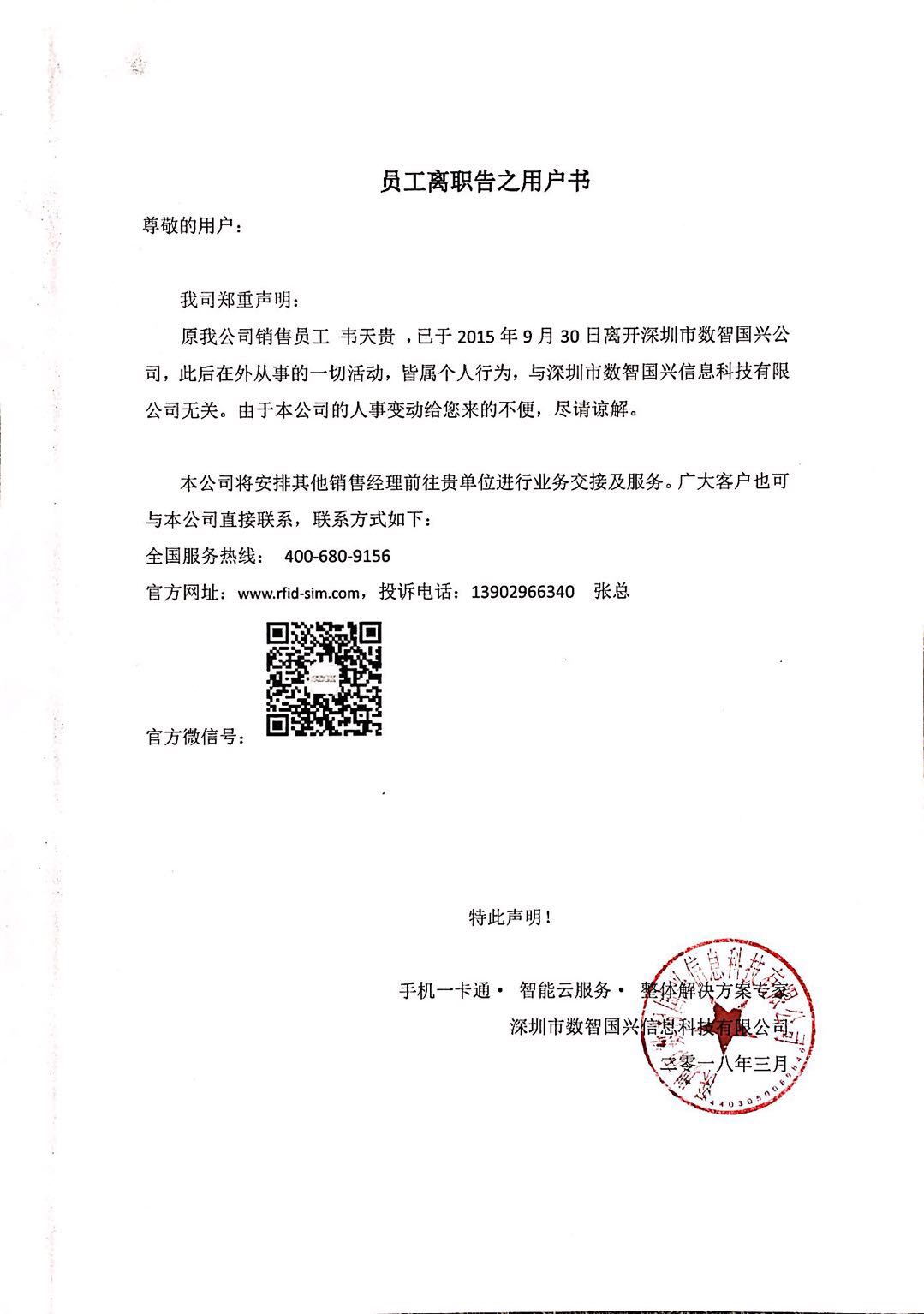 原我司销售员工韦天贵,已于2015年9月30日离开深圳市数智国兴公司,此后在外从事的一切活动,皆属个人行为,与深圳市数智国兴信息科技有限公司无关。由于本公司的人事变动给您带来不便之处,尽请谅解。