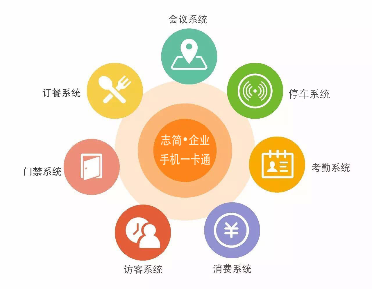 应用系统模块:志简手机一卡通云服务系统+奇点智能售后服务系统 (门禁、考勤、消费)子系统。
