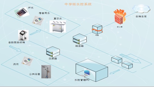 志简水控系统由用户智能卡、一体水控器、水控管理PC、自助服务终端等几部分组成。水控管理PC通过Internet连接云端服务器,对水控系统进行操作和管理。