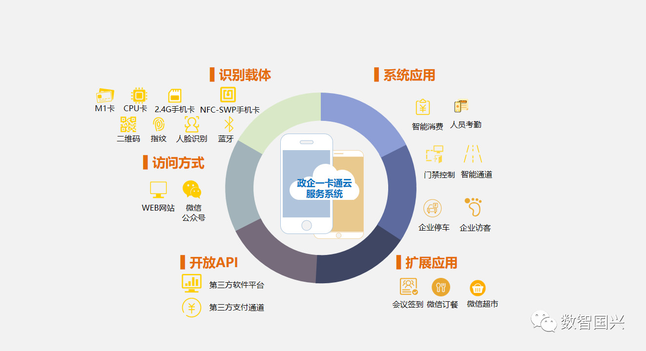 智能消费、人员考勤、门禁控制、智能通道、企业停车、企业访客、会议签到、微信订餐、微信超市
