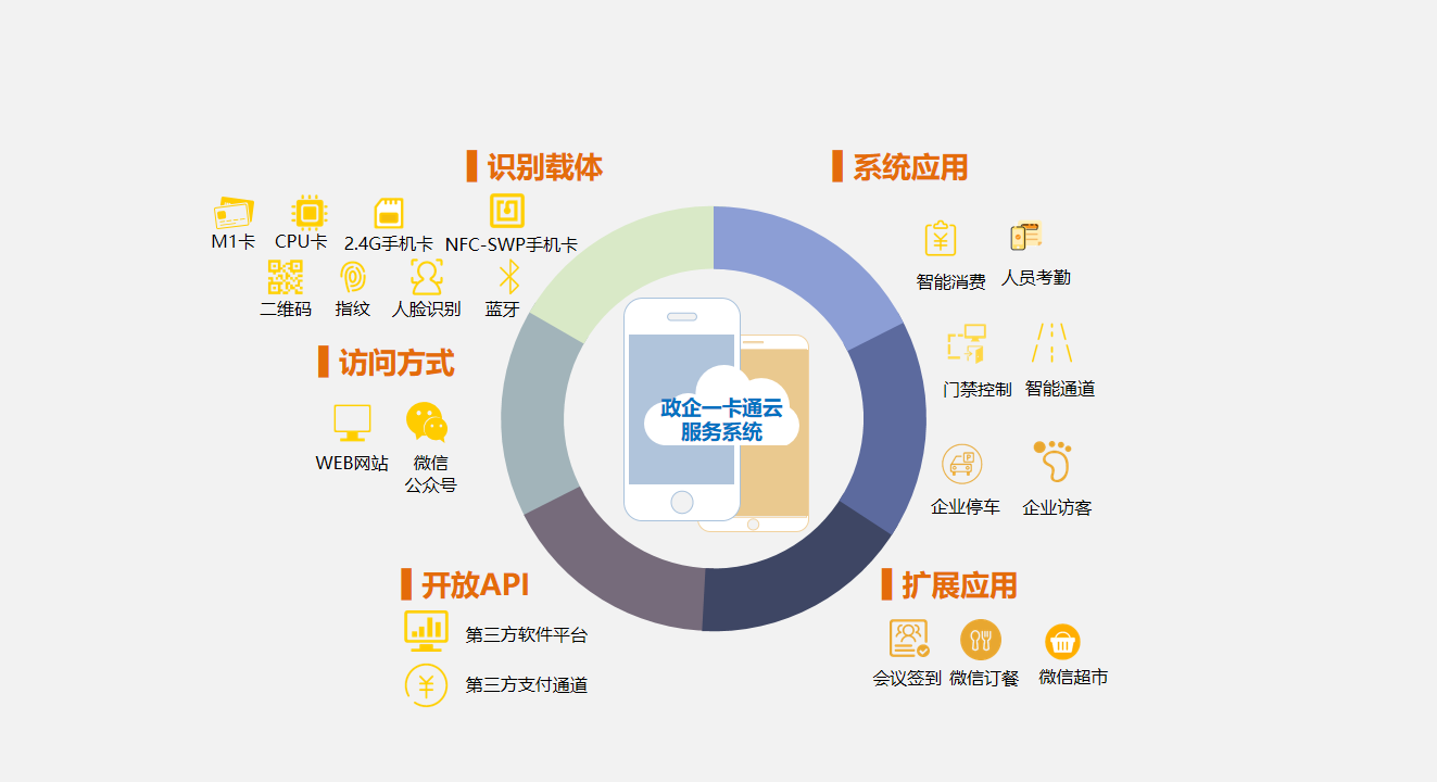 智能消费、人员考勤、门禁控制、智能通道、企业停车、企业访客、会议签到、微信订餐、微信超市