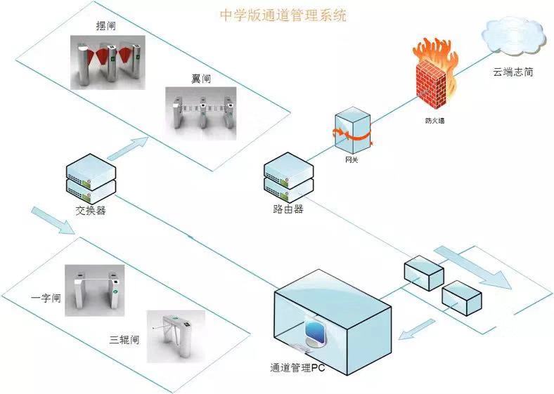 志简中学版通道系统由用户智能卡、通道闸、门禁控制器、门禁感应器等几部分组成,通过Internet连接云端服务器,对通道系统进行操作和管理。道闸介绍:根据外观可分:翼闸、摆闸、三辊闸、一字闸机芯使用电机:有刷电机或无刷电机。有刷电机,即普通电机,寿命与其碳刷磨损有关,价格相对便宜;无刷电机运行平稳,省电,使用寿命长,是升级产品,但价格较贵。翼闸、三辊闸:一般用于校门、图书馆、宿舍通道人员通行;摆闸、一字闸:一般用于校门非机动车道(自行车、摩托车通行)